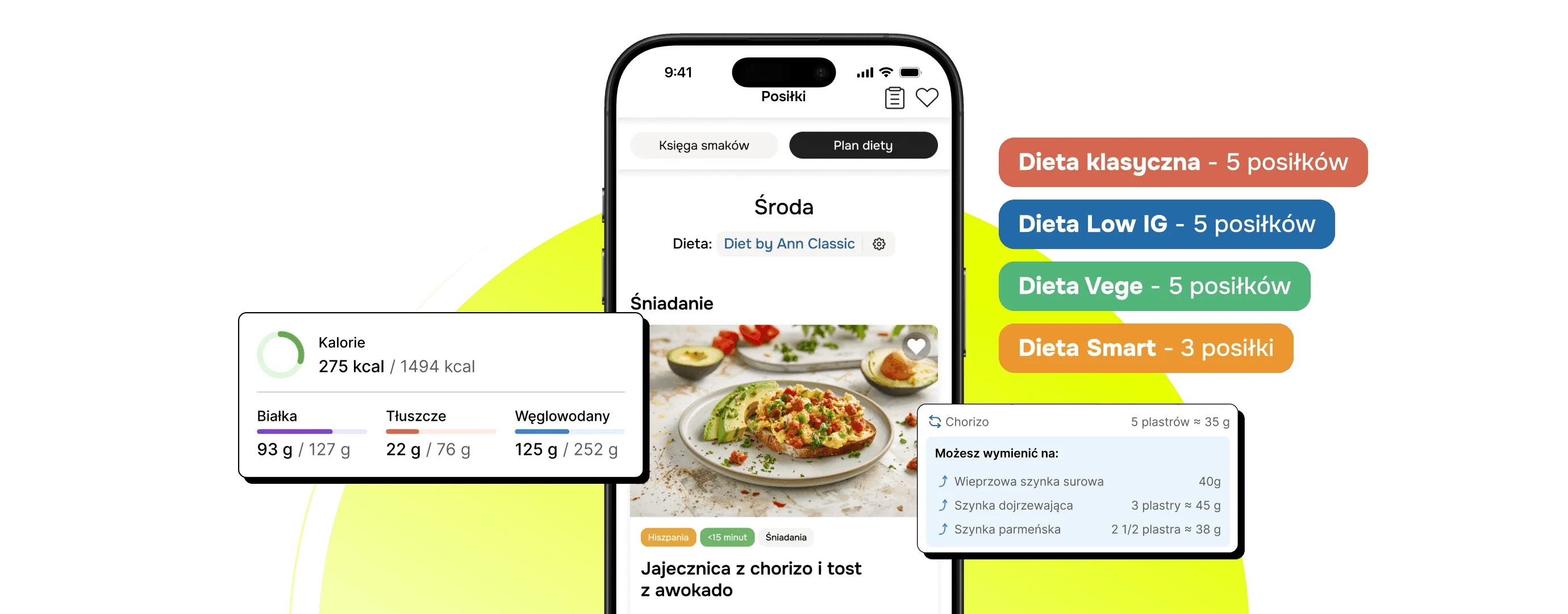 Lub pełna swoboda: wymieniaj składniki i przepisy jednym kliknięciem. Precyzja i elastyczność w jednym miejscu – jedz zdrowo, tak jak lubisz.