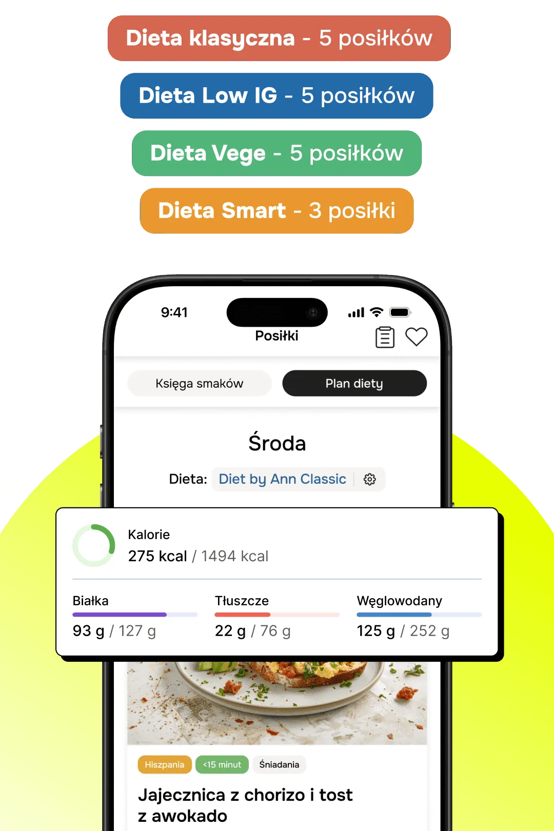 🥗 Jedz po swojemu. Zapisuj posiłki jednym zdjęciem, dotknięciem lub krótkim opisem. Dopasuj samodzielnie makro do swoich potrzeb lub wybieraj gotowe profile – od zbilansowanego po keto. AI przeliczy kalorie i makroskładniki z każdego dodanego posiłku za Ciebie — automatycznie.